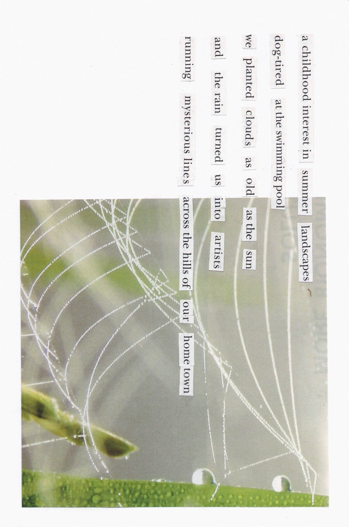a childhood interest in summer landscapes dog-tired at the swimming pool we planted clouds as old as the sun and the rain turned us into artists running mysterious lines across the hills of our hometown